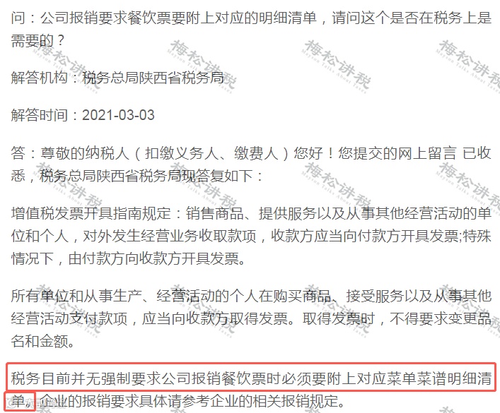 从上述税务局答疑可以看出,税务上并未有任何明确规定,餐饮费必须附菜单才能报销。