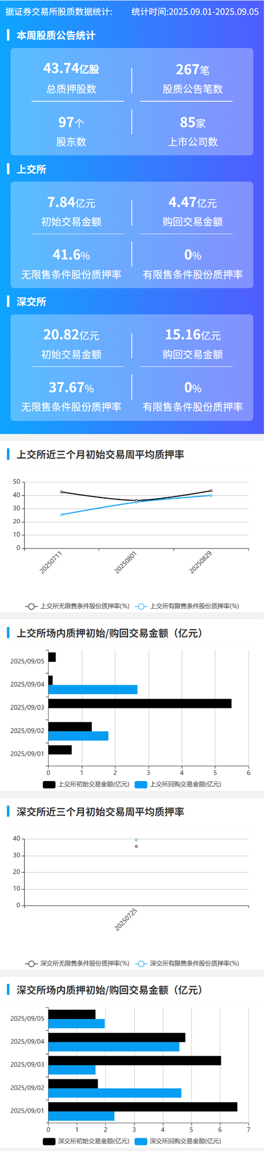 2025年9月1日至2025年9月5日,市场共85家上市公司发布267笔质押公告,涉及股东97人,总质押股数43.74亿股。上交所初始交易金额7.84亿元,购回交易金额4.47亿元;深交所初始交易金额20.82亿元,购回交易金额15.16亿元。