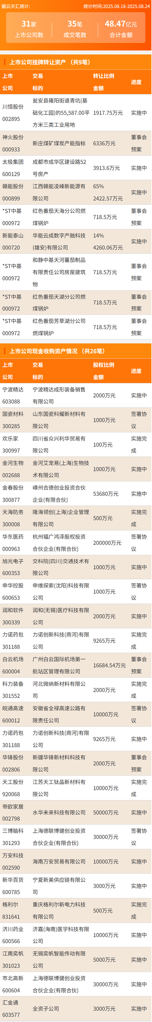 2025年8月18日至2025年8月24日,资产交易合计金额48.47亿元,上市公司数31家,成交笔数35笔,其中上市公司挂牌转让资产9笔,现金收购资产26笔。