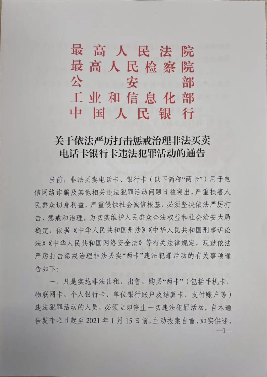 近日,最高人民法院、最高人民检察院、公安部、工业和信息化部、中国人民银行联合发布《关于依法严厉打击惩戒治理非法买卖电话卡银行卡违法犯罪活动的通告》,以“零容忍”的态度严厉打击非法买卖“两卡”违法犯罪活动,进一步加强行业监管,在全国范围内对涉“两卡”违法犯罪人员实施惩戒,深入推进“断卡”行动,全力斩断非法买卖“两卡”黑灰产业链条。