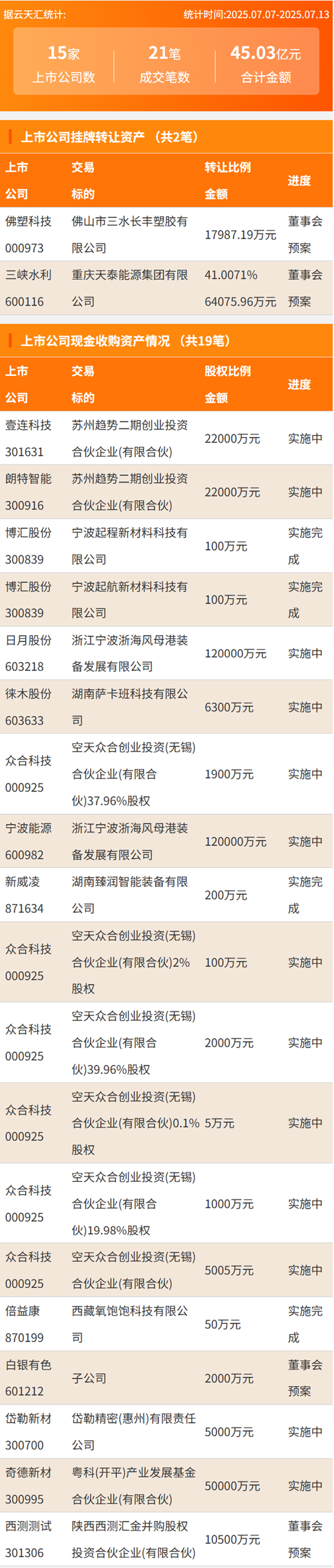 2025年7月7日至2025年7月13日,资产交易合计金额45.03亿元,上市公司数15家,成交笔数21笔,其中上市公司挂牌转让资产2笔,现金收购资产19笔。
