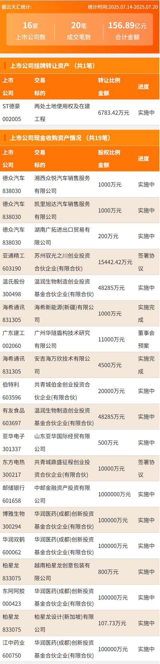 2025年7月14日至2025年7月20日,资产交易合计金额156.89亿元,上市公司数16家,成交笔数20笔,其中上市公司挂牌转让资产1笔,现金收购资产19笔。