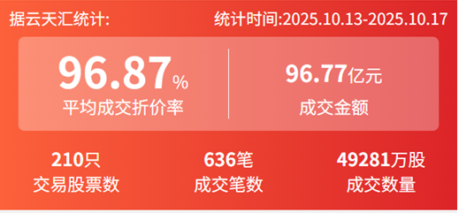 2025年10月13日至2025年10月19日,大宗交易成交金额96.77亿元,交易股票数210只,成交笔数636笔,平均成交折价率为96.87%,成交数量4.93亿股。