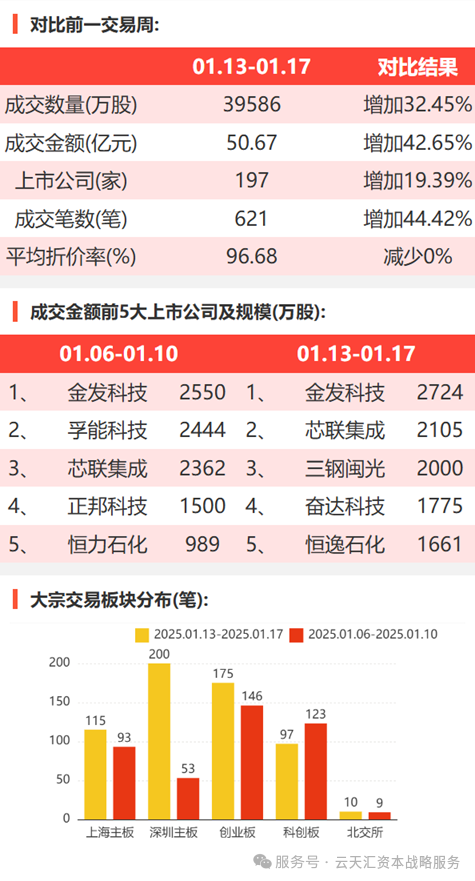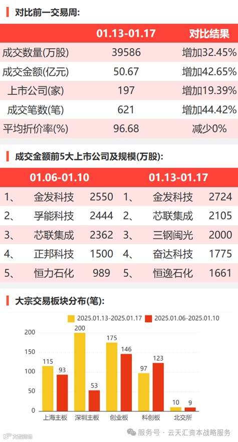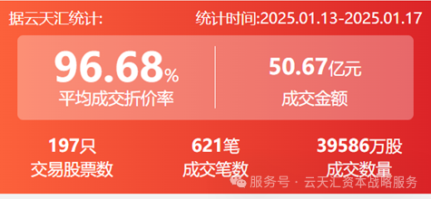 2025年1月13日至2025年1月17日,大宗交易成交金额50.67亿元,交易股票数197只,成交笔数621笔,平均成交折价率为96.68%,成交数量3.96亿股。