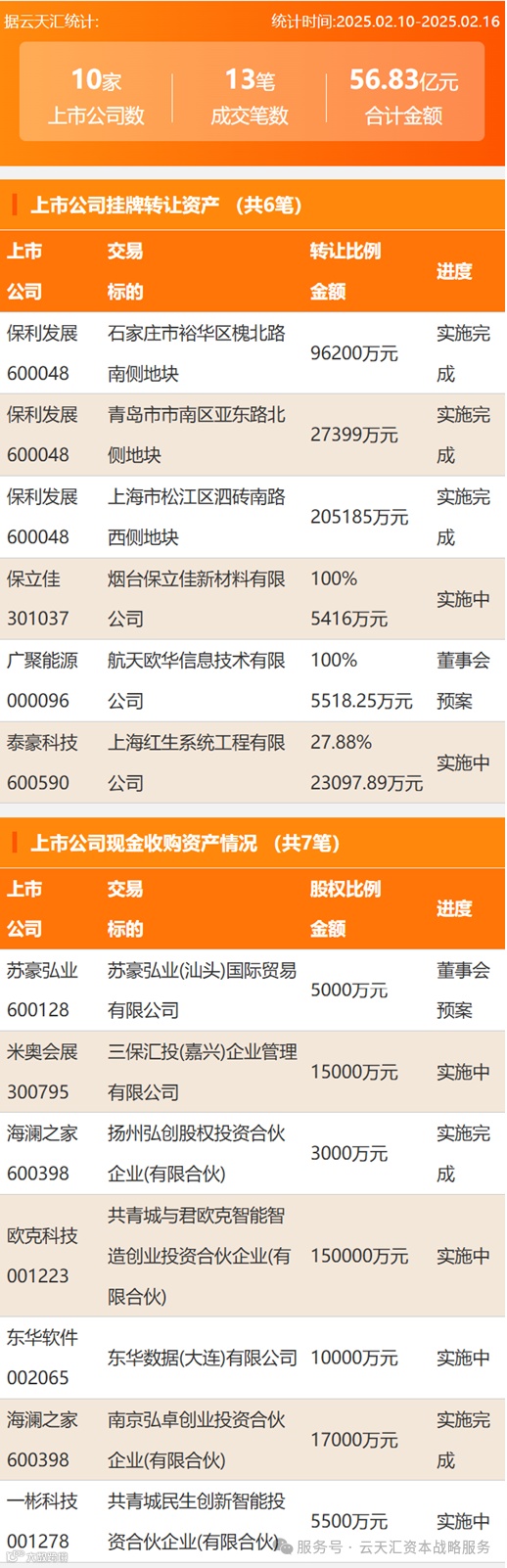 2025年2月10日至2025年2月16日,资产交易合计金额56.83亿元,上市公司数10家,成交笔数13笔,其中上市公司挂牌转让资产6笔,现金收购资产7笔。