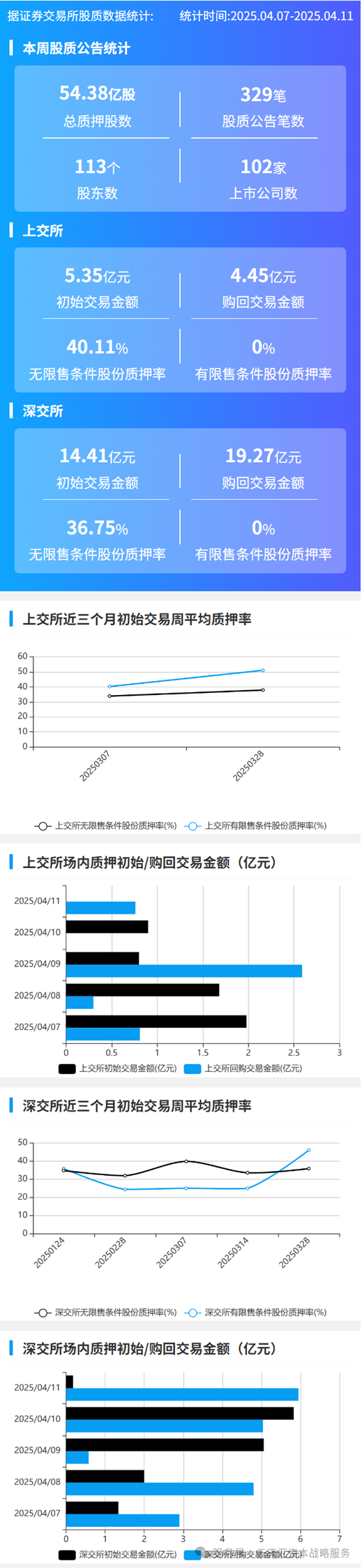 2025年4月7日至2025年4月11日,市场共102家上市公司发布329笔质押公告,涉及股东113人,总质押股数54.38亿股。上交所初始交易金额5.35亿元,购回交易金额4.45亿元;深交所初始交易金额14.41亿元,购回交易金额19.27亿元。