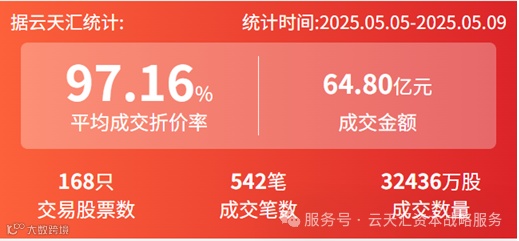 2025年5月5日至2025年5月9日,大宗交易成交金额64.80亿元,交易股票数168只,成交笔数542笔,平均成交折价率为97.16%,成交数量3.24亿股。