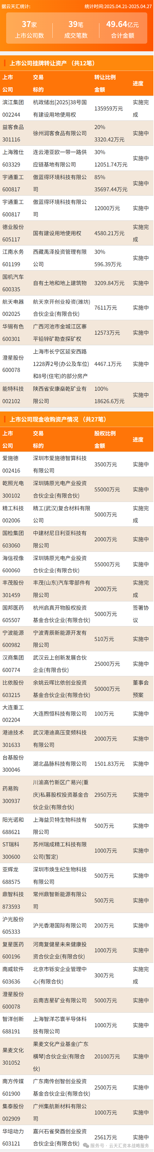 2025年4月21日至2025年4月27日,资产交易合计金额49.64亿元,上市公司数37家,成交笔数39笔,其中上市公司挂牌转让资产12笔,现金收购资产27笔。