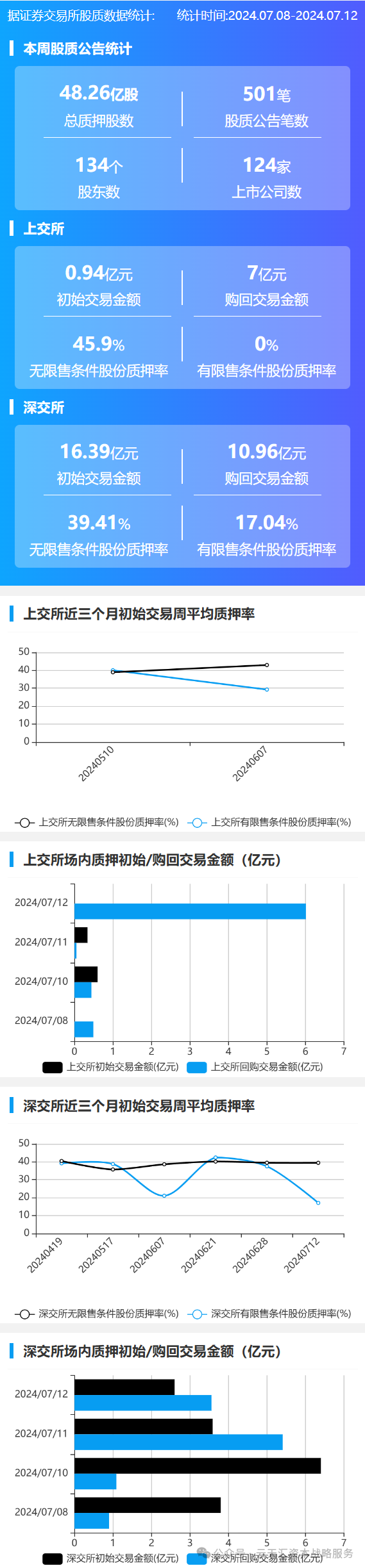 2024年7月8日至2024年7月12日,市场共124家上市公司发布501笔质押公告,涉及股东134人,总质押股数48.26亿股。上交所初始交易金额0.94亿元,购回交易金额7亿元;深交所初始交易金额16.39亿元,购回交易金额10.96亿元。