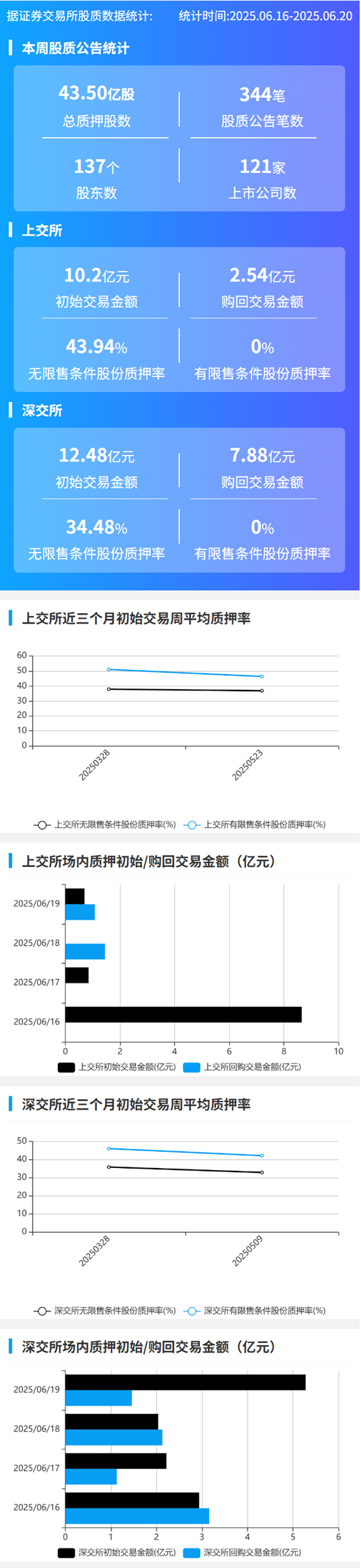 2025年6月16日至2025年6月20日,市场共121家上市公司发布344笔质押公告,涉及股东137人,总质押股数43.50亿股。上交所初始交易金额10.2亿元,购回交易金额2.54亿元;深交所初始交易金额12.48亿元,购回交易金额7.88亿元。
