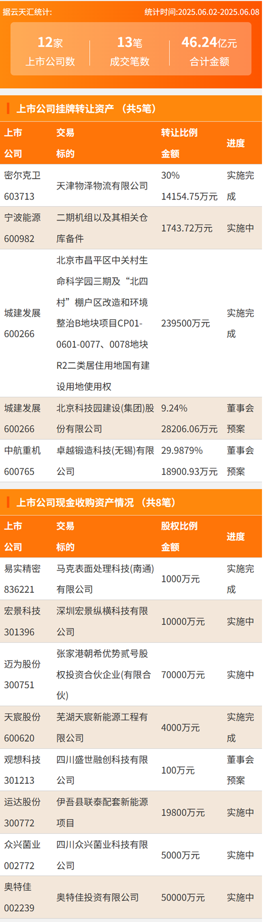 2025年6月2日至2025年6月8日,资产交易合计金额46.24亿元,上市公司数12家,成交笔数13笔,其中上市公司挂牌转让资产5笔,现金收购资产8笔。