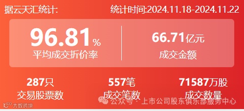 2024年11月18日至2024年11月22日,大宗交易成交金额66.71亿元,交易股票数287只,成交笔数557笔,平均成交折价率为96.81%,成交数量7.16亿股。