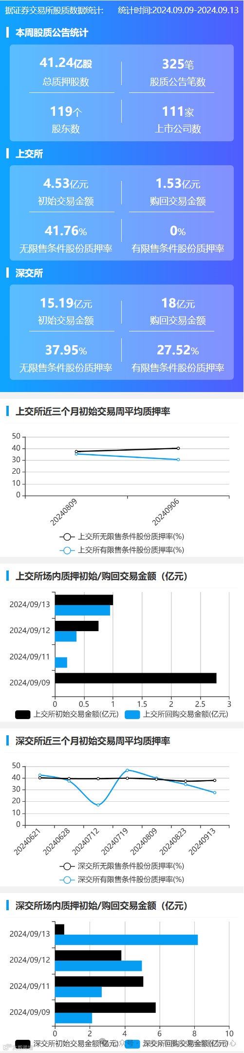 2024年9月9日至2024年9月13日,市场共111家上市公司发布325笔质押公告,涉及股东119人,总质押股数41.24亿股。上交所初始交易金额4.53亿元,购回交易金额1.53亿元;深交所初始交易金额15.19亿元,购回交易金额18亿元。