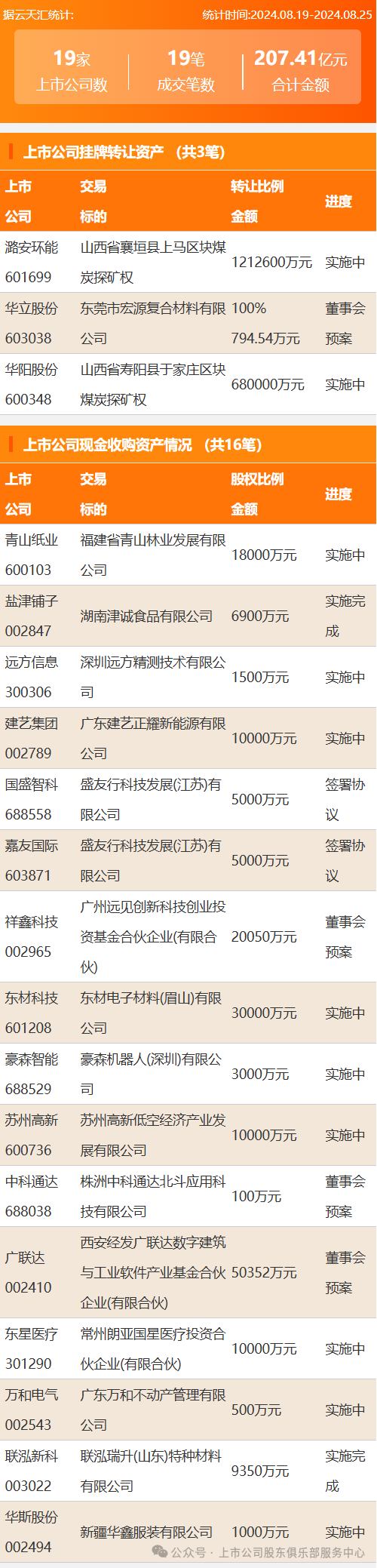 2024年8月19日至2024年8月25日,资产交易合计金额207.41亿元,上市公司数19家,成交笔数19笔,其中上市公司挂牌转让资产3笔,现金收购资产16笔。