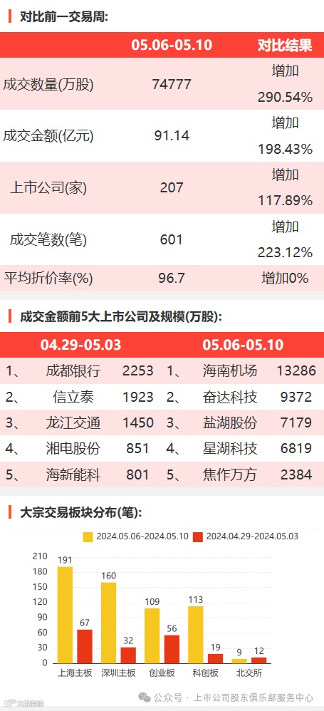 2024年5月6日至2024年5月10日,大宗交易成交金额91.14亿元,交易股票数207只,成交笔数601笔,平均成交折价率为96.7%,成交数量7.48亿股。