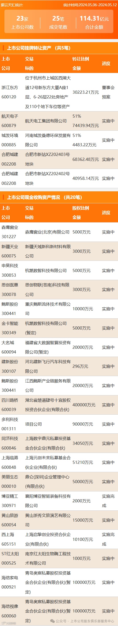 2024年5月6日至2024年5月12日,资产交易合计金额114.31亿元,上市公司数23家,成交笔数25笔,其中上市公司挂牌转让资产5笔,现金收购资产20笔。