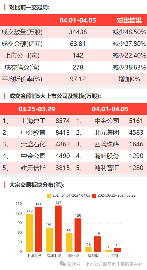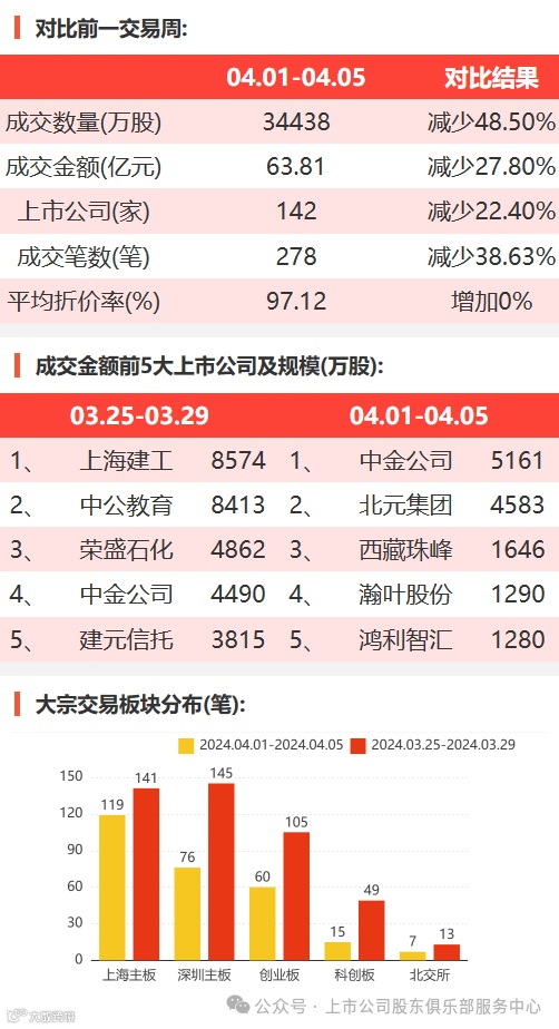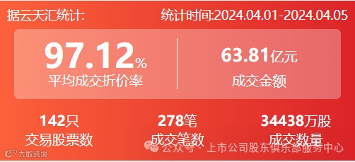 2024年4月1日至2024年4月5日,大宗交易成交金额63.81亿元,交易股票数142只,成交笔数278笔,平均成交折价率为97.12%,成交数量3.44亿股。