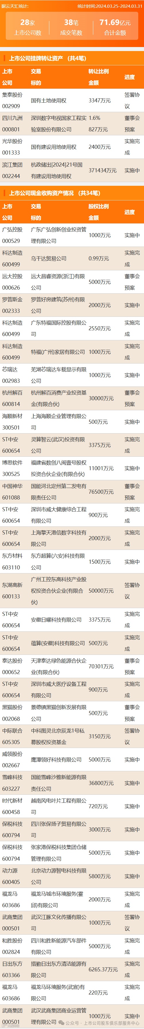 2024年3月25日至2024年3月31日,资产交易合计金额71.69亿元,上市公司数28家,成交笔数38笔,其中上市公司挂牌转让资产4笔,现金收购资产34笔。