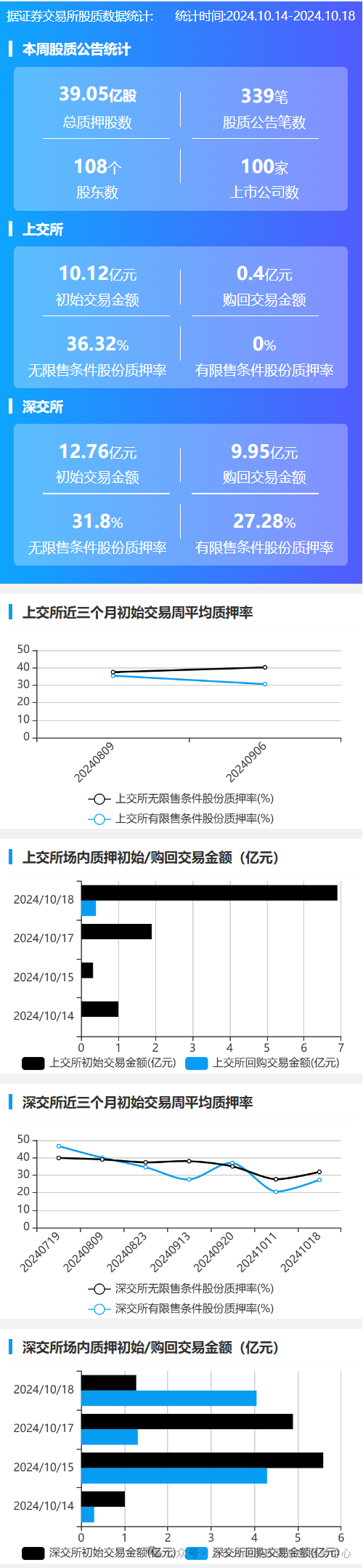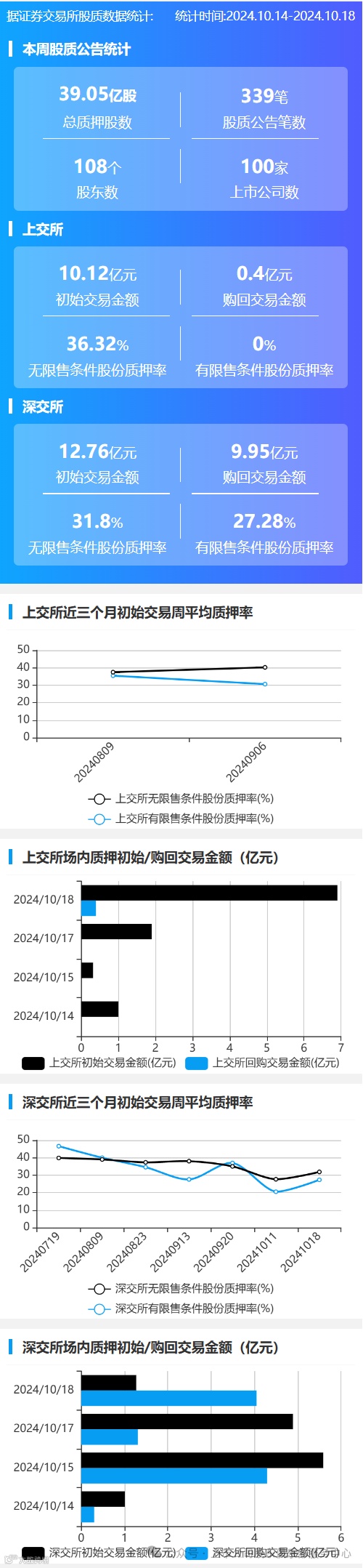 2024年10月14日至2024年10月18日,市场共100家上市公司发布339笔质押公告,涉及股东108人,总质押股数39.05亿股。上交所初始交易金额10.12亿元,购回交易金额0.4亿元;深交所初始交易金额12.76亿元,购回交易金额9.95亿元。
