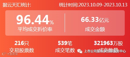 2023年10月9日至2023年10月13日,大宗交易成交金额66.33亿元,交易股票数216只,成交笔数539笔,平均成交折价率为96.44%,成交数量32.19亿股。