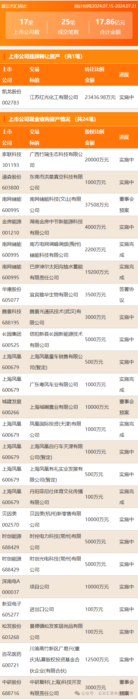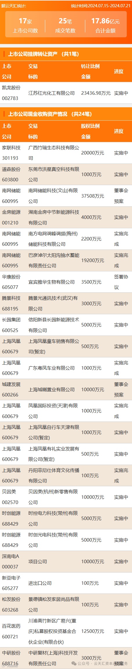 2024年7月15日至2024年7月21日,资产交易合计金额17.86亿元,上市公司数17家,成交笔数25笔,其中上市公司挂牌转让资产1笔,现金收购资产24笔。