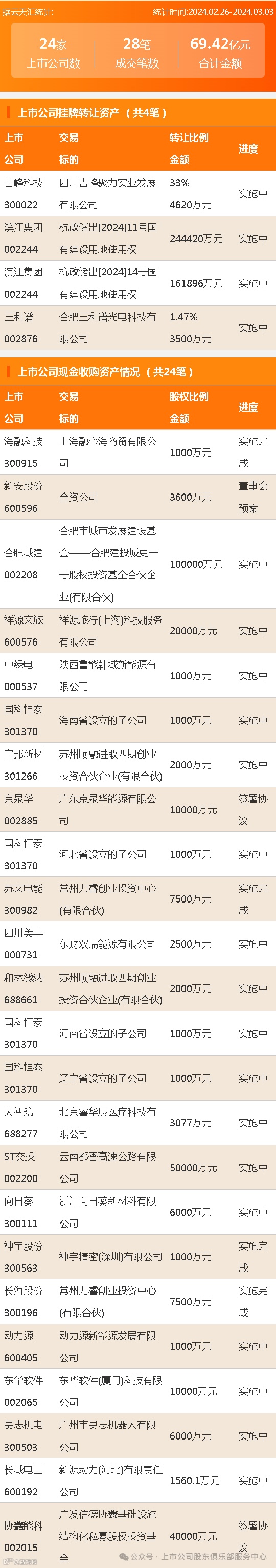 2024年2月26日至2024年3月3日,资产交易合计金额69.42亿元,上市公司数24家,成交笔数28笔,其中上市公司挂牌转让资产4笔,上市公司现金收购资产24笔。