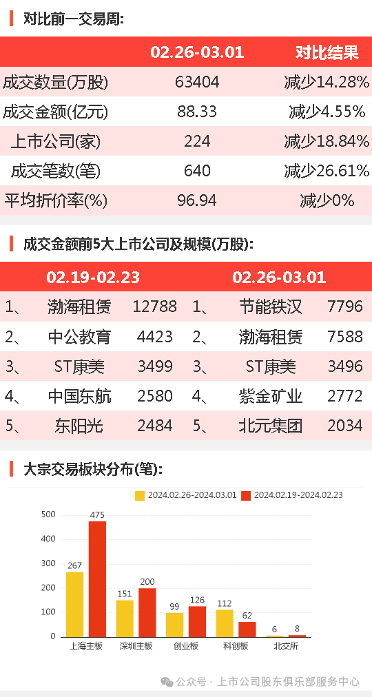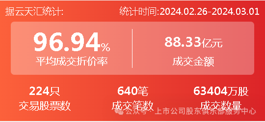 2024年2月26日至2024年3月1日,大宗交易成交金额88.33亿元,交易股票数224只,成交笔数640笔,平均成交折价率为96.94%,成交数量6.34亿股。