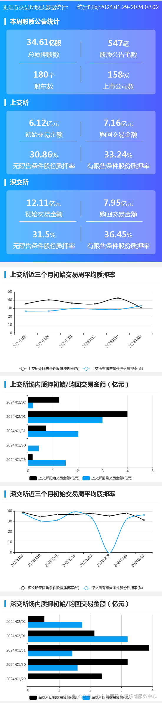 2024年1月29日至2024年2月2日,市场共158家上市公司发布547笔质押公告,涉及股东180人,总质押股数34.61亿股。上交所初始交易金额6.12亿元,购回交易金额7.16亿元;深交所初始交易金额12.11亿元,购回交易金额7.95亿元。