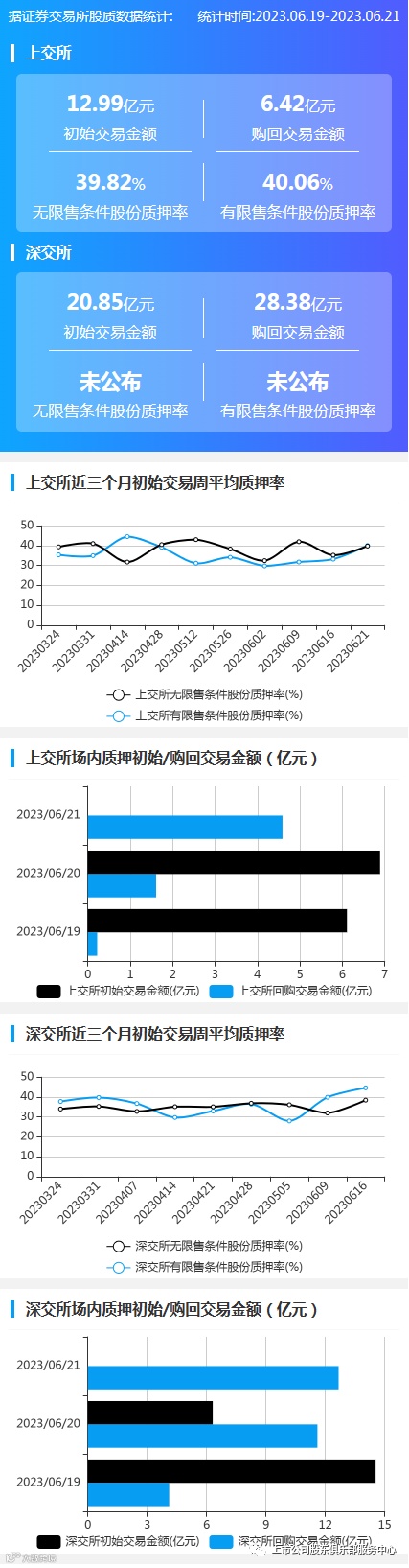 2023年6月19日至2023年6月21日,上交所初始交易金额12.99亿元,购回交易金额6.42亿元;深交所初始交易金额20.85亿元,购回交易金额28.38亿元。