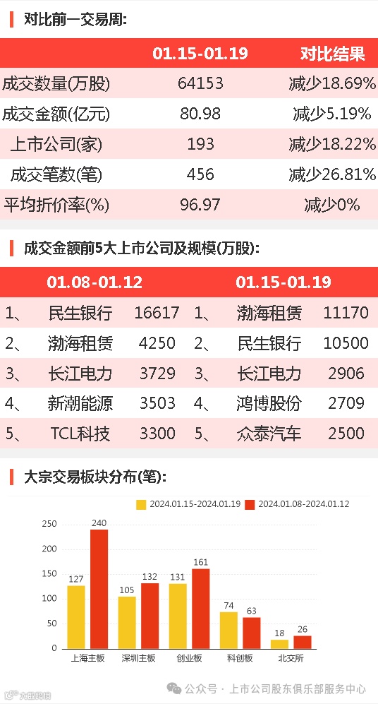 2024年1月15日至2024年1月19日,大宗交易成交金额80.98亿元,交易股票数193只,成交笔数456笔,平均成交折价率为96.97%,成交数量6.42亿股。