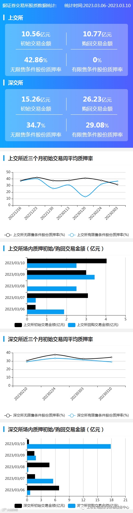 2023年3月6日至2023年3月10日,上交所初始交易金额10.56亿元,购回交易金额10.77亿元;深交所初始交易金额15.26亿元,购回交易金额26.23亿元。