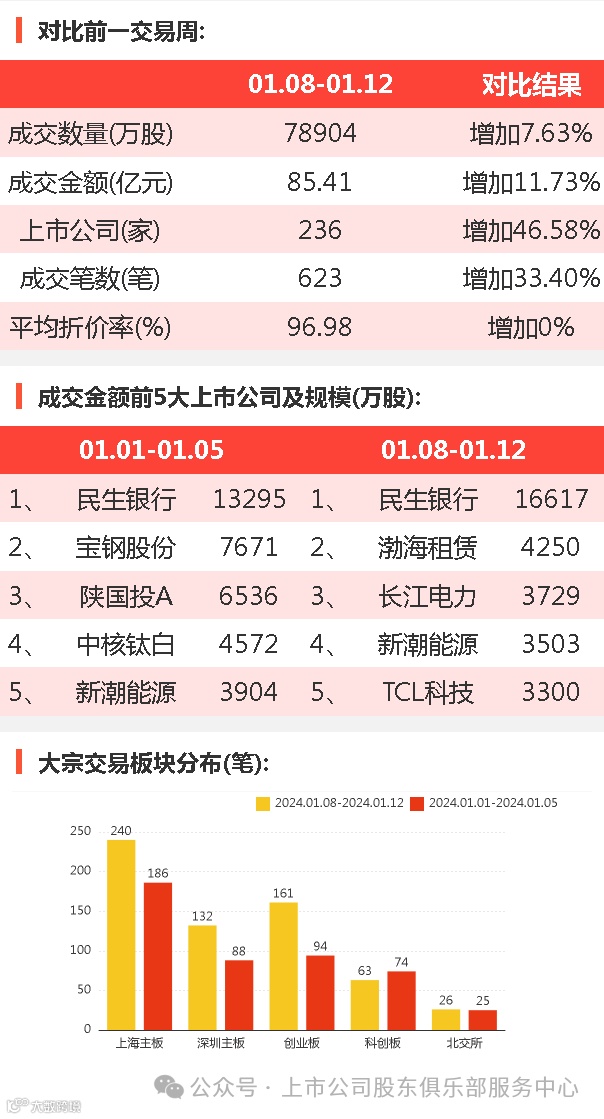 2024年1月8日至2024年1月12日,大宗交易成交金额85.41亿元,交易股票数236只,成交笔数623笔,平均成交折价率为96.98%,成交数量7.89亿股。