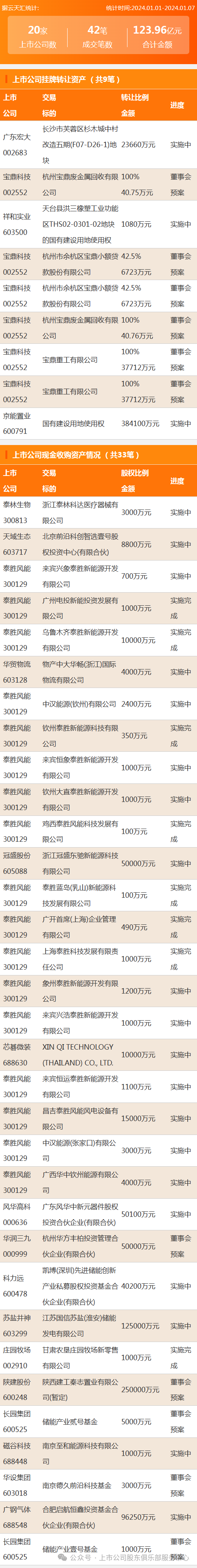 2024年1月1日至2024年1月7日,资产交易合计金额123.96亿元,上市公司数20家,成交笔数42笔,其中上市公司挂牌转让资产9笔,上市公司现金收购资产33笔。