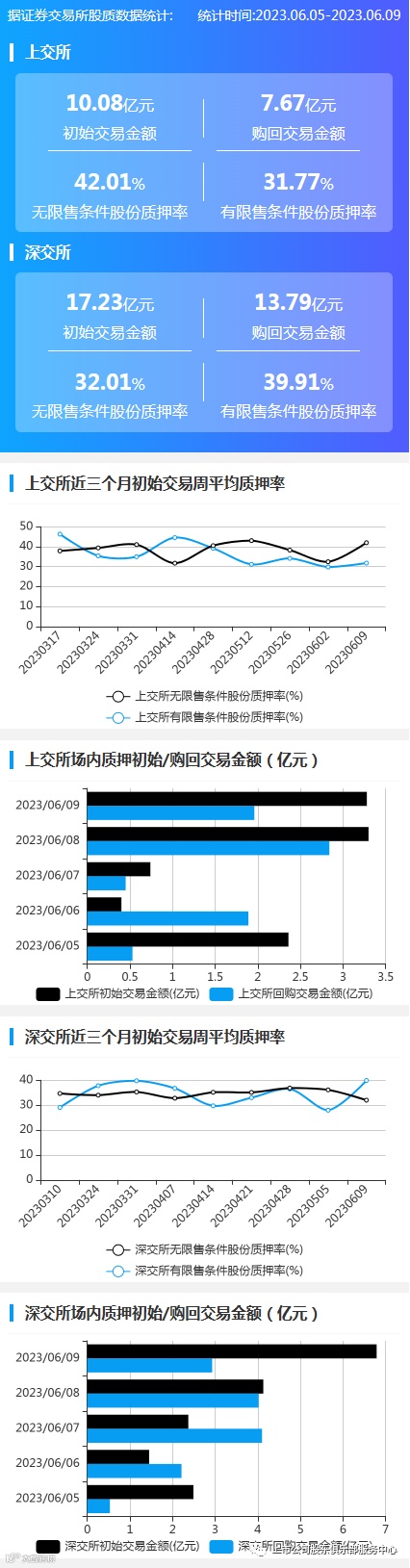 2023年6月5日至2023年6月9日,上交所初始交易金额10.08亿元,购回交易金额7.67亿元;深交所初始交易金额17.23亿元,购回交易金额13.79亿元。