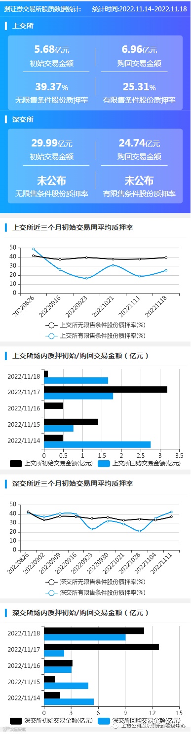 2022年11月14日至2022年11月18日,上交所初始交易金额5.68亿元,购回交易金额6.96亿元;深交所初始交易金额29.99亿元,购回交易金额24.74亿元。