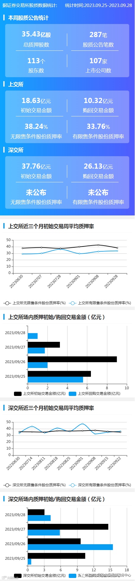 2023年9月25日至2023年9月28日,市场共107家上市公司发布287笔质押公告,涉及股东113人,总质押股数35.43亿股。上交所初始交易金额18.63亿元,购回交易金额10.32亿元;深交所初始交易金额37.76亿元,购回交易金额26.13亿元。