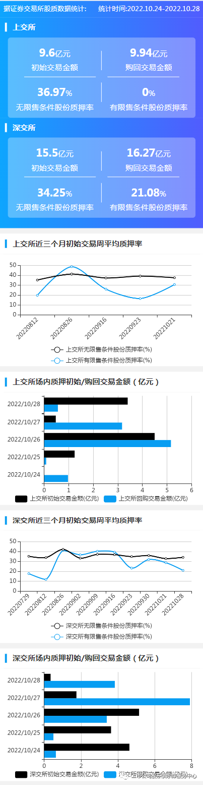 2022年10月24日至2022年10月28日,上交所初始交易金额9.6亿元,购回交易金额9.94亿元;深交所初始交易金额15.5亿元,购回交易金额16.27亿元。