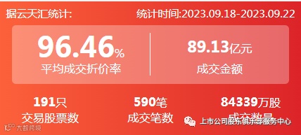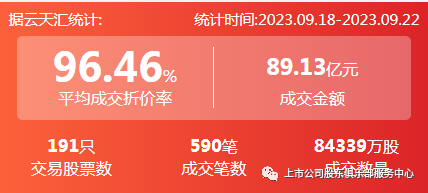 2023年9月18日至2023年9月22日,大宗交易成交金额89.13亿元,交易股票数191只,成交笔数590笔,平均成交折价率为96.46%,成交数量84339万股。