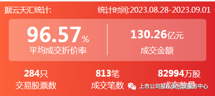 2023年8月28日至2023年9月1日,大宗交易成交金额130.26亿元,交易股票数284只,成交笔数813笔,平均成交折价率为96.57%,成交数量82994万股。