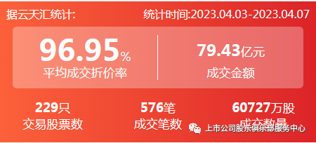 2023年4月3日至2023年4月7日,大宗交易成交金额79.32亿元,交易股票数229只,成交笔数576笔,平均成交折价率为96.95%,成交数量60727万股。