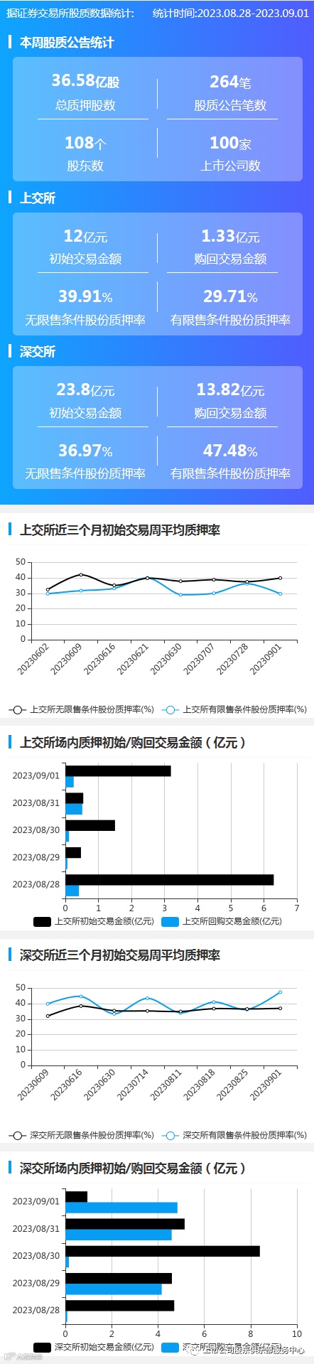 2023年8月28日至2023年9月1日,市场共100家上市公司发布264笔质押公告,涉及股东108人,总质押股数36.58亿股。上交所初始交易金额12亿元,购回交易金额1.33亿元;深交所初始交易金额23.8亿元,购回交易金额13.82亿元。