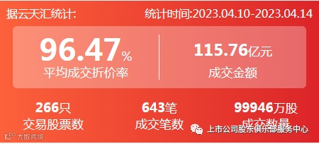 2023年4月10日至2023年4月14日,大宗交易成交金额115.76亿元,交易股票数266只,成交笔数643笔,平均成交折价率为96.47%,成交数量99946万股。