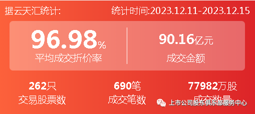2023年12月11日至2023年12月15日,大宗交易成交金额90.16亿元,交易股票数262只,成交笔数690笔,平均成交折价率为96.98%,成交数量7.79亿股。