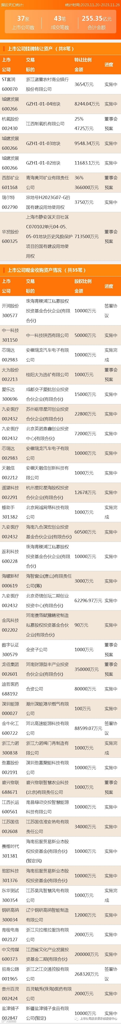 2023年11月20日至2023年11月26日,资产交易合计金额255.35亿元,上市公司数37家,成交笔数43笔,其中上市公司挂牌转让资产8笔,上市公司现金收购资产35笔。