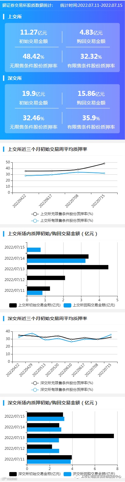 2022年7月11日至2022年7月15日,上交所初始交易金额11.27亿元,购回交易金额4.83亿元;深交所初始交易金额19.9亿元,购回交易金额15.86亿元。