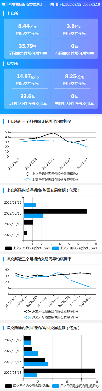2022年8月15日至2022年8月19日,上交所初始交易金额8.44亿元,购回交易金额3.6亿元;深交所初始交易金额14.97亿元,购回交易金额8.25亿元。