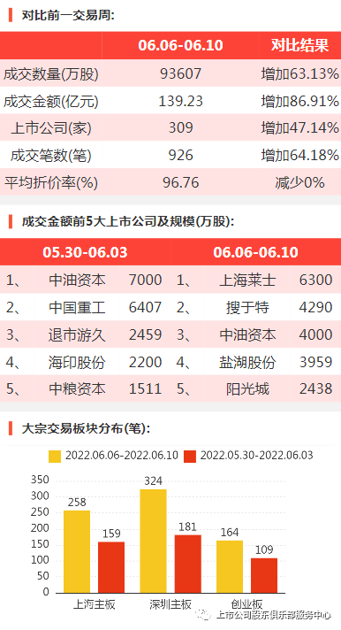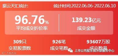 2022年6月6日至2022年6月10日,大宗交易成交金额139.23亿元,交易股票数309只,成交笔数926笔,平均成交折价率为96.76%,成交数量93607万股。