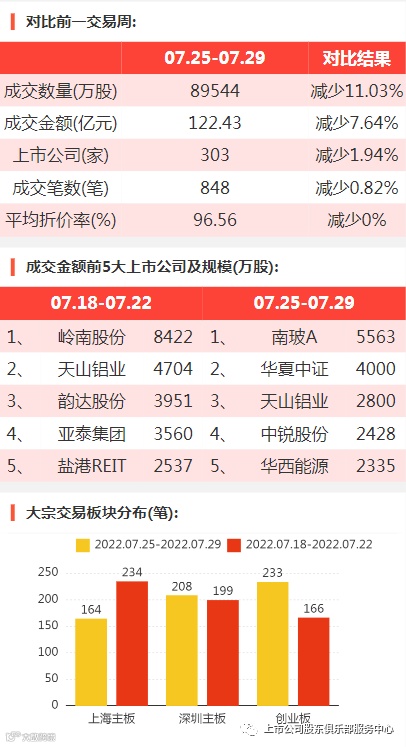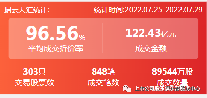 2022年7月25日至2022年7月29日,大宗交易成交金额122.43亿元,交易股票数303只,成交笔数848笔,平均成交折价率为96.56%,成交数量89544万股。