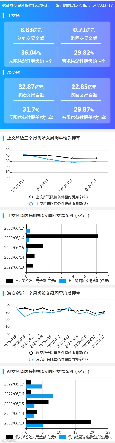 2022年6月13日至2022年6月17日,上交所初始交易金额8.83亿元,购回交易金额0.71亿元;深交所初始交易金额32.87亿元,购回交易金额22.85亿元。