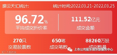 2022年3月21日至2022年3月25日,大宗交易成交金额111.52亿元,交易股票数270只,成交笔数650笔,平均成交折价率为96.72%,成交数量88260万股。